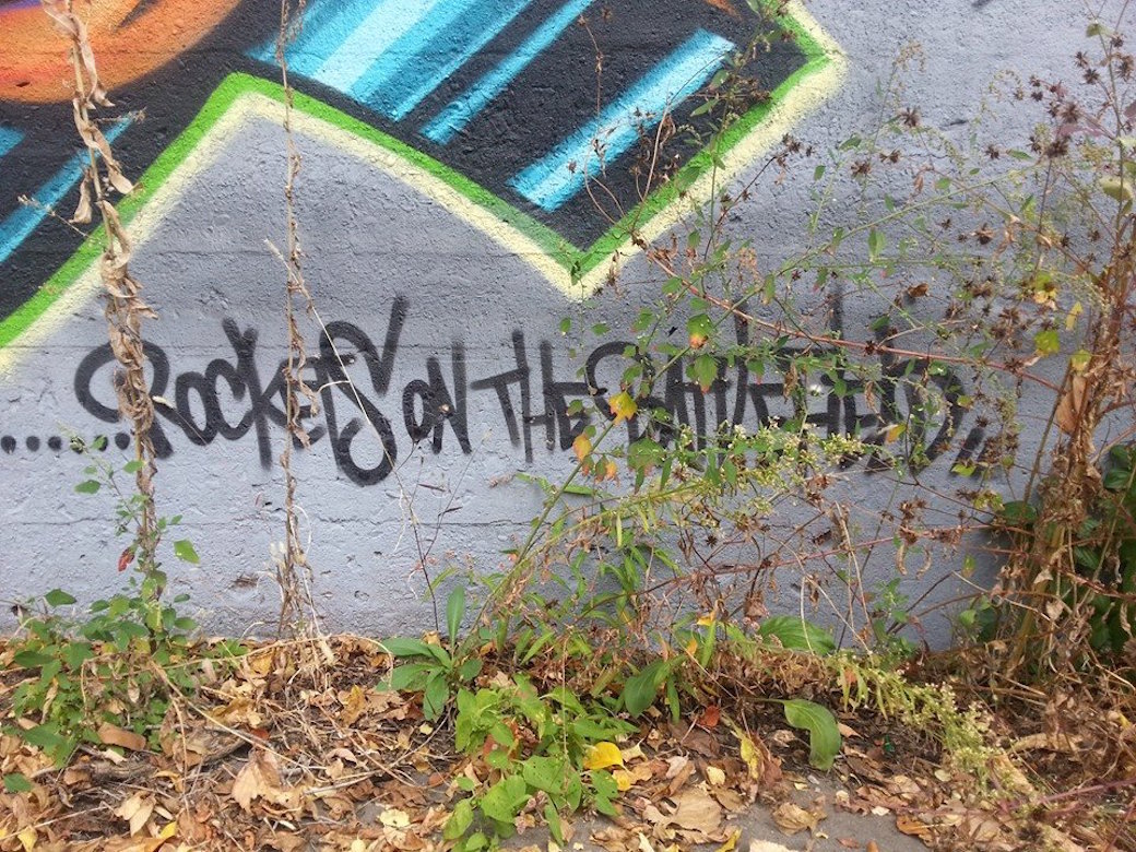 TURDL was an awesome piece. Very simply drawn turtles with no face. Just a mouth, shell and legs. Oh, and the TURDL is riding a skate board. How awesome is that? I really liked TURDL a lot. Some other pieces were super cool. Take this next one for example. I’ve ever seen graffiti have a roof and a road before. I have no idea where that comes from.