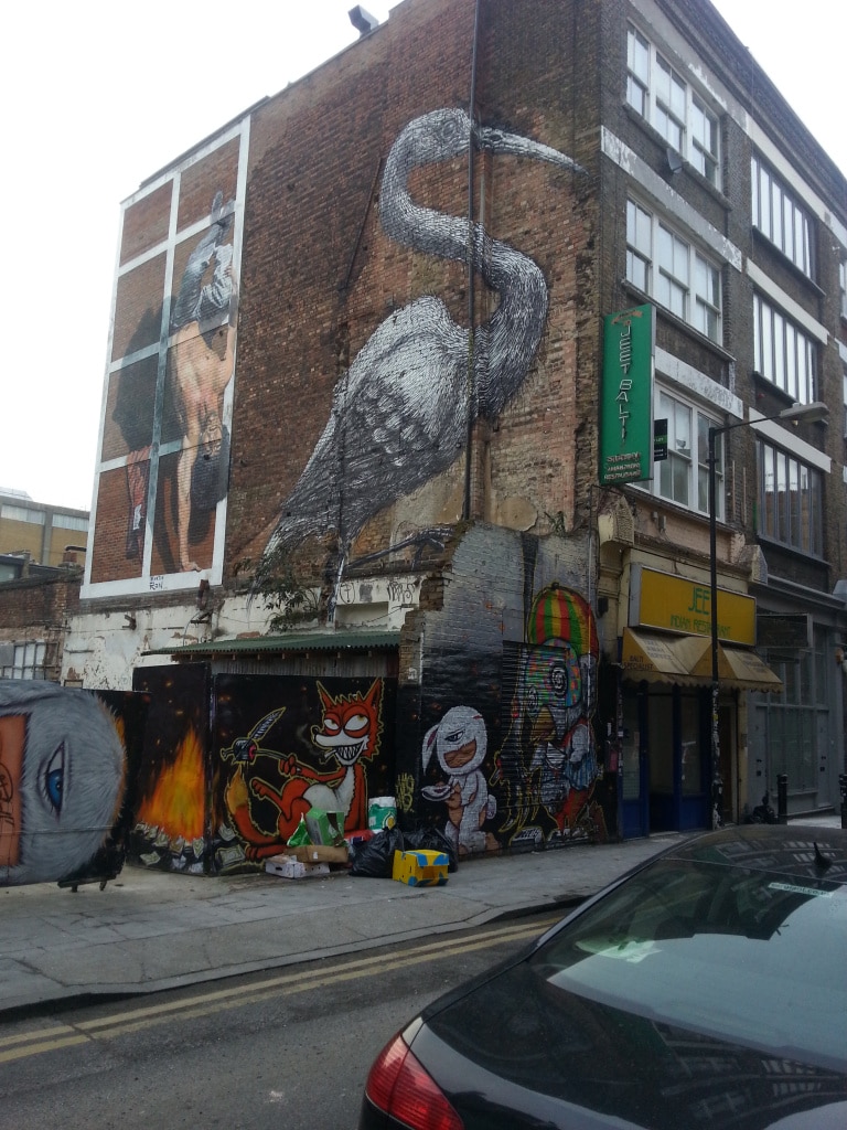 After code street, we walked down Bethnal Green Rd in Shoreditch. This road had a ton of different pieces. A giant rat, a lock and safe company with a safe door painted around the main entrance, and some traditional street graffiti tagging. Doug took us to this awesome parking lot and turned us around. There was this giant building with this mural that was painted by a husband and wife team. It looks like an underwater piece, but it could also be birds in the sky. Either way it was awesome.
