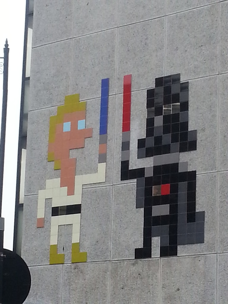 So we’re walking down this road and Doug starts telling us this story. An artist (Invader) and his friends rented a cherry picker (a crane) and lifted the artist up to a building and the artist stuck his work to this building. The building is a bank. Invader gets up on this crane and he is sticking this artwork to the bank building. Meanwhile his friends are dressed as construction workers and directing traffic around the crane in the middle of the night. Can you imagine? That’s so awesome. So here is INVADERS work. I leave you with the best. Thanks for reading my blog and thanks for visiting my .vegas domain!