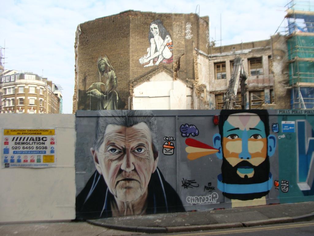 The last part of the tour was simply amazing. Doug showed us this wall that is painted over once a week. Yes, every week this wall is transformed into something new. Our week had this giant hand attached to a machine that kind of looked like a tank. See the pictures below. Next was this wall where we saw a guy, in real time, painting. He had permission (I’m sure) and he was just going for it. It was a pretty awesome piece. It was on a wall with like 4 or 5 other art works. This guys work was all interconnected. He used many different colors and it really stood out. The next piece ways a little bit down the road. It was a cowboy in a hat. Now what is really cool about this street art work was that the artist was only in town for 24 hours. Shoreditch is a good distance away from the airport. About an hour and a half. So the artist lands, paints and leaves. His work was this cowboy and it was unique because he dipped the cans in ice water to slow down the release of the paint. It added this amazing effect to the piece. I can’t say enough. Check out the cowboy below. The last piece that Doug showed us was this plaster on the side of a building. The artist used a jack hammer, that’s right, and carved out this face. Now, he had to have permission to do this because who wouldn’t hear that going on? Exactly. I snapped a few other shots and they are shown below.